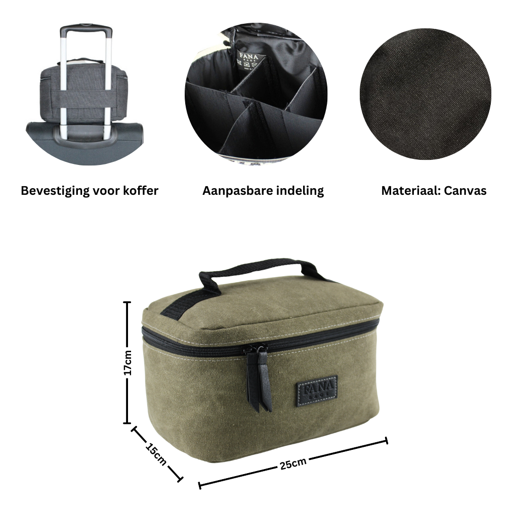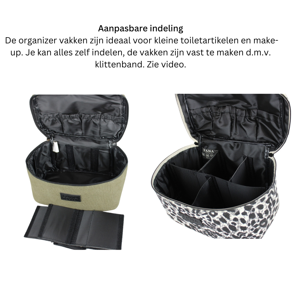 De beautycase canvas is zeer compact en biedt toch ontzettend veel ruimte waardoor je gemakkelijk alle essentiële toiletartikelen kunt opbergen. De toilettas past in iedere koffer, reistas of backpack. Het hoofdcompartiment van de toilettas is geschikt voor toiletartikelen van een groter formaat. De organizer vakken zijn ideaal voor kleine toiletartikelen en make-up. Je kan alles zelf indelen, de vakken zijn vast te maken d.m.v. klittenband. Je kan zelf kiezen hoeveel vakken je wilt, of niet en één grote vak behouden. Dit is zeer handig en overzichtelijk!