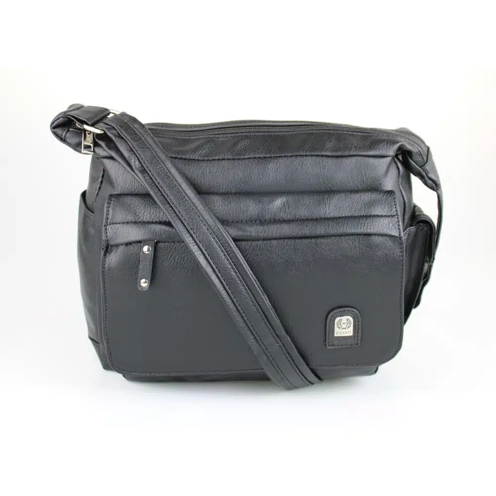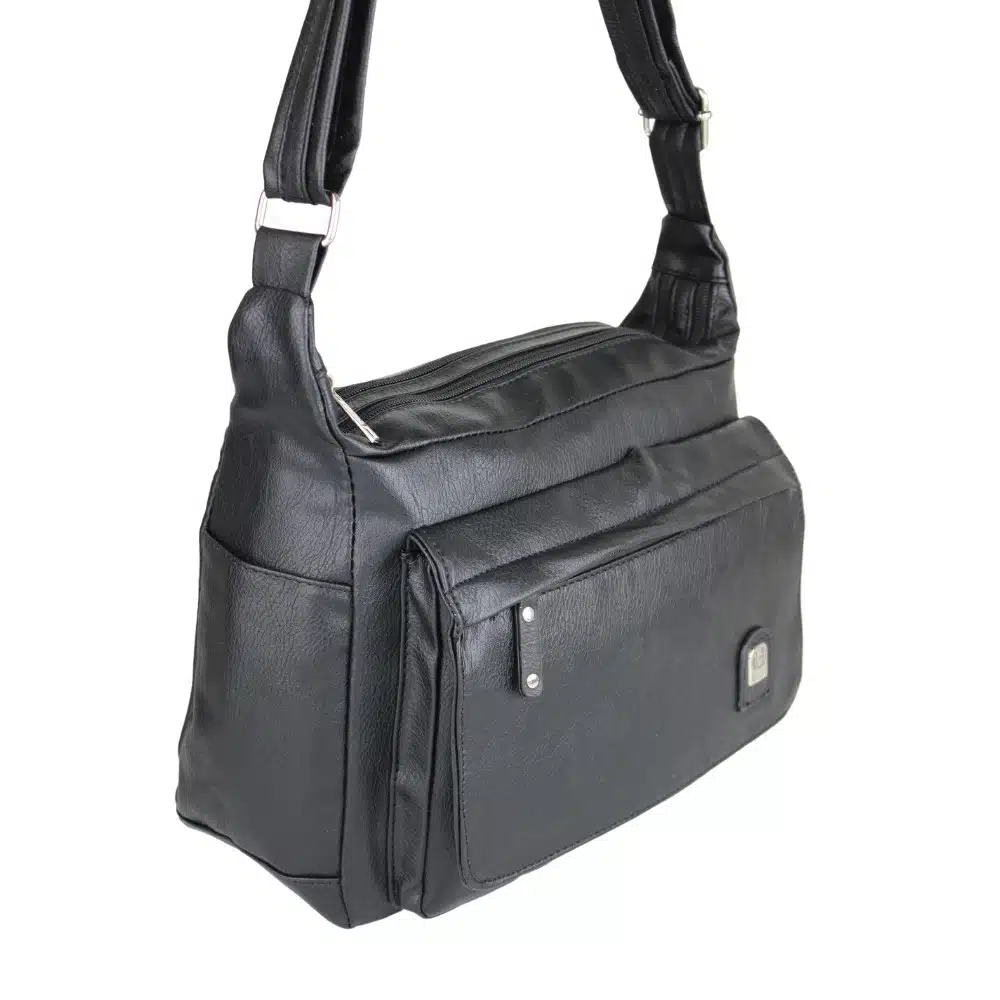 Dames schoudertas kopen? Trendy modieuze damestassen zwart kunstleer met veel vakken.