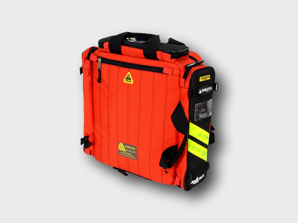 Very robust, spacious and practical emergency backpack from the French brand Dimatex. Very beautifully finished and made with the best materials. On the outside 5 zip pockets. On the inside 6 transparent and removable pouches. Can be carried as backpack, handbag, shoulder bag or with trolley.