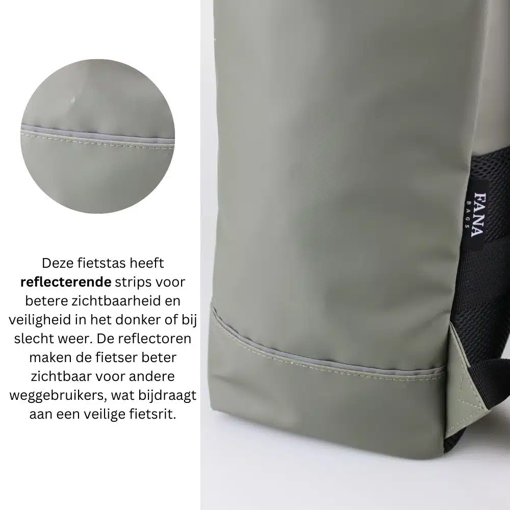 - Reflecterende Strips: Voor extra veiligheid is de tas uitgerust met reflecterende strips, zodat je goed zichtbaar bent in het donker.