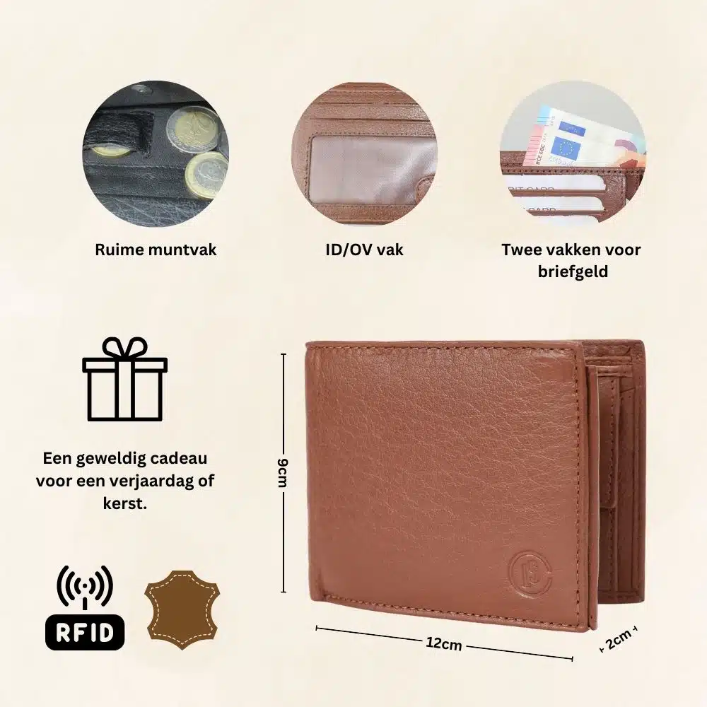 Heren Portemonnee Billfold: Deze stijlvolle portemonnee in een prachtige lichtbruine/cognac kleur combineert moderne technologie met klassiek design. Gemaakt van hoogwaardig echt leer, is deze portemonnee niet alleen tijdloos en elegant, maar ook uiterst functioneel. Dankzij de ingebouwde RFID-bescherming blijven je pasjes veilig tegen skimming, zodat je persoonlijke gegevens beschermd zijn tegen ongewenste scans.