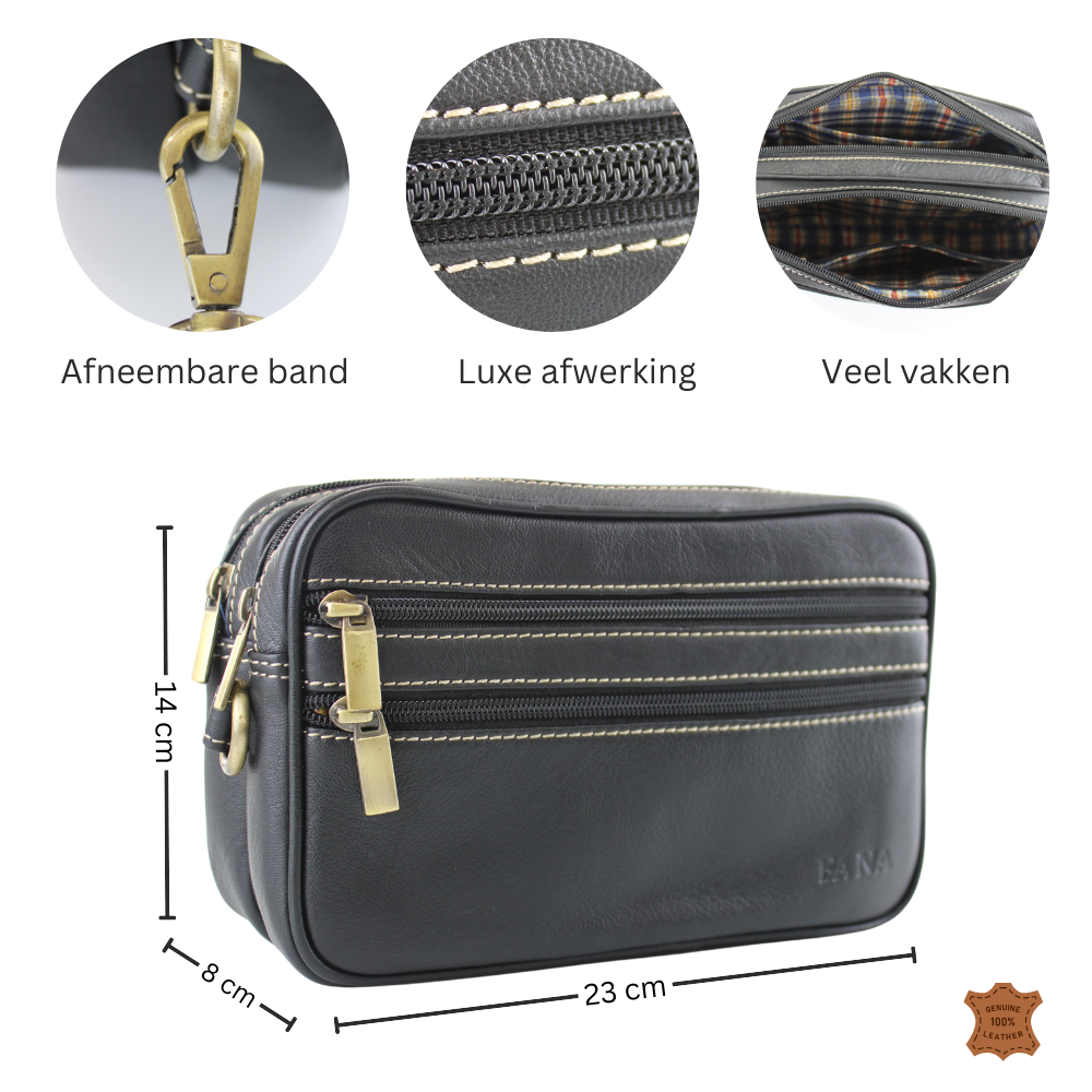 - Flexibel Gebruik: Een leren polstas is veelzijdig in gebruik. Je kunt het als een polstas gebruiken voor dagelijks gebruik of als een toilettas wanneer je reist.