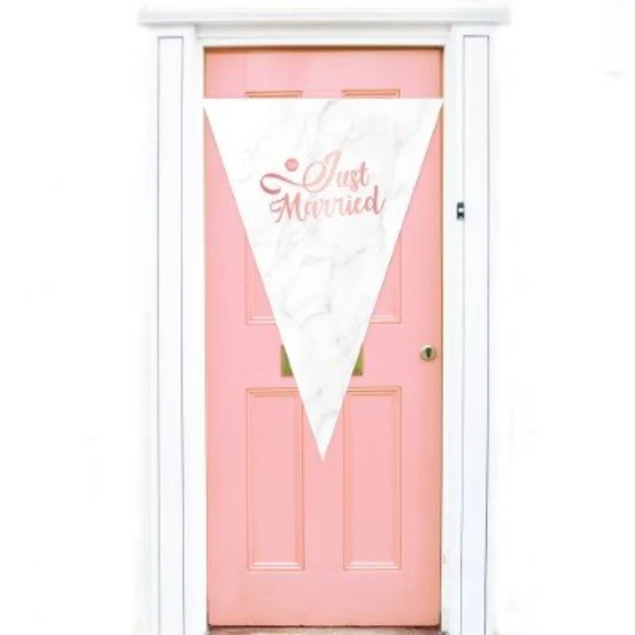Vier de liefde met deze elegante Just Married puntvlag in roségoud! Een prachtige eyecatcher voor bruiloften, recepties of fotoshoots. De metallic tint geeft een romantische, stijlvolle uitstraling. Hang ’m buiten, binnen of op de trouwlocatie. Verkrijgbaar bij SoLow, waar liefde en decoratie samenkomen!